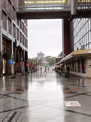 | 2025年4月撮影 あいにくの雨ながら本館と新館の間から見える小倉城 |